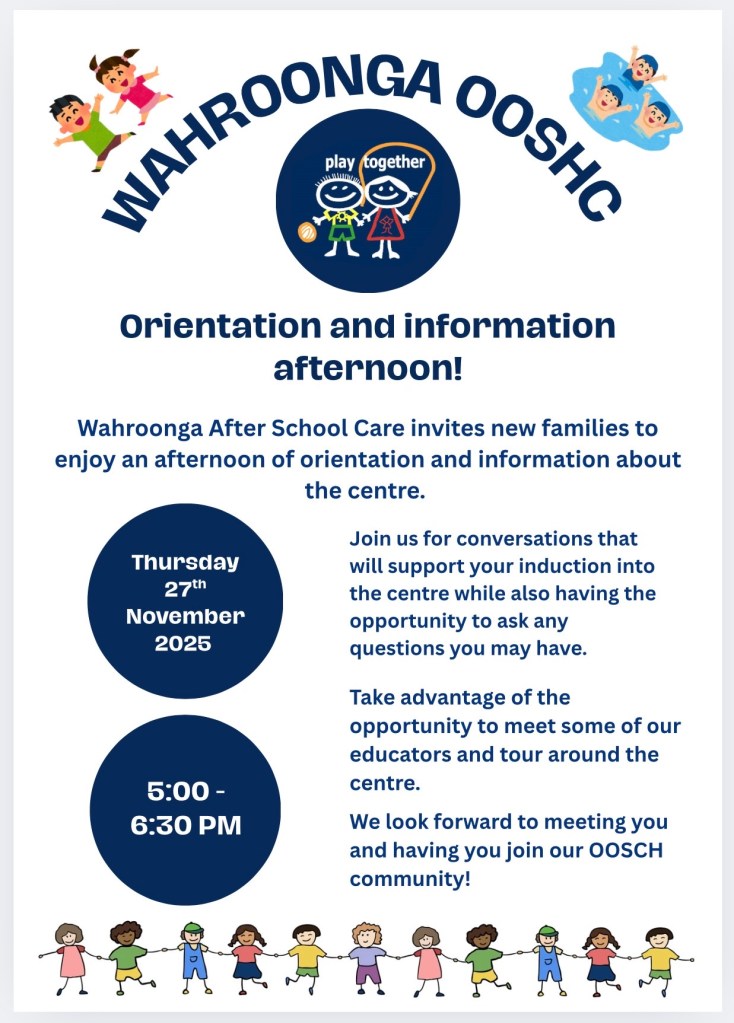 Four our new families, we invite you to our Orientation and Information afternoon on the 27th of November! We will be running the event from 5:00-6:30 pm.